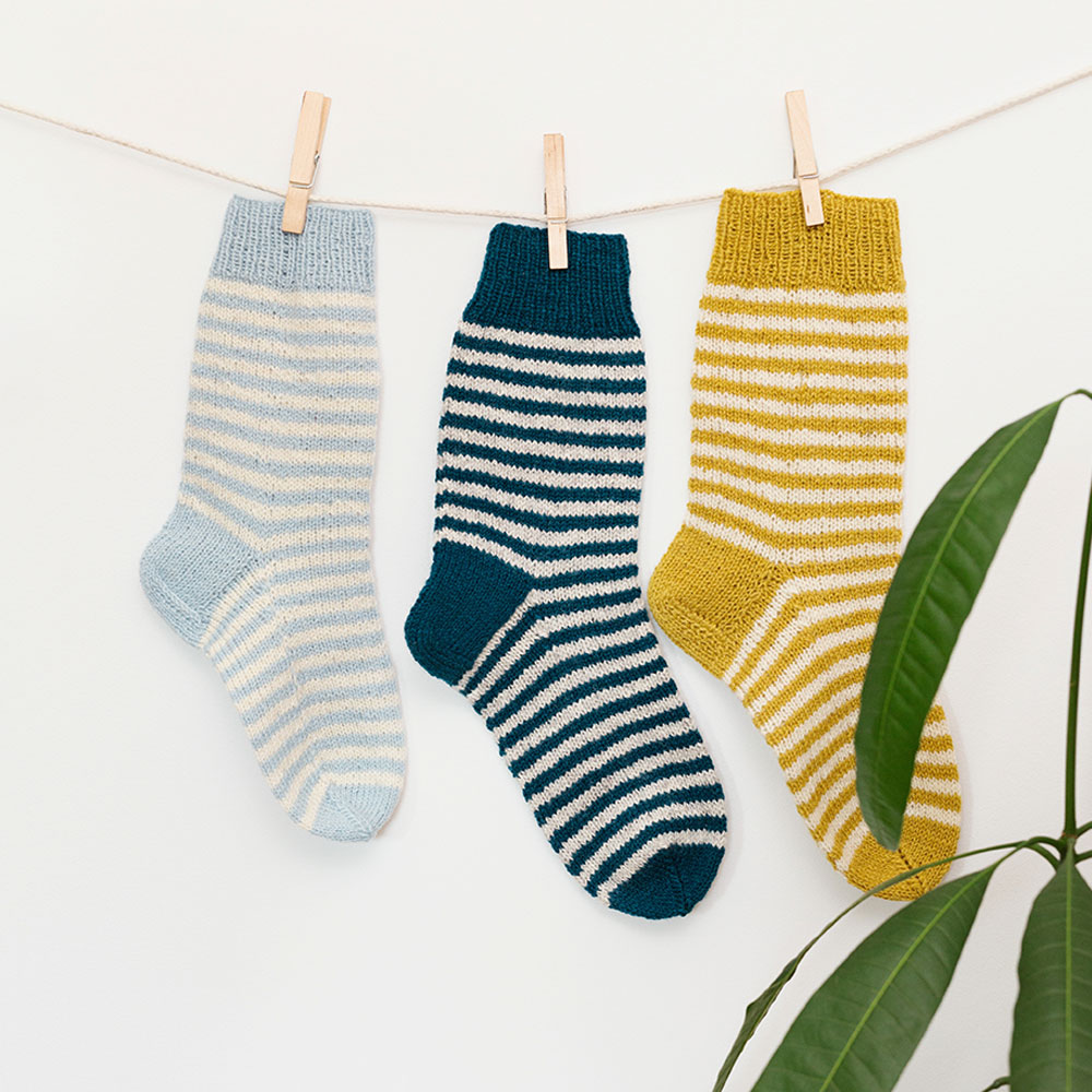 Små ränder – stora möjligheter! De här charmiga sockarna stickas i 2-tråds Gammelserie och är perfekta för att leka med färgkombinationer. De stickas uppifrån och ner med klassisk häl och enkel struktur – lagom enkla för nybörjare, men lika roliga för den som stickat många sockar förut.