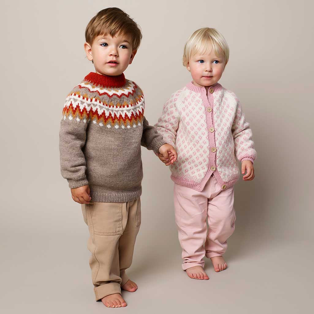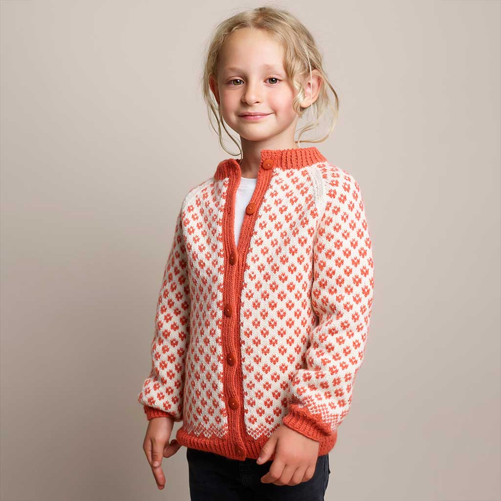 350-2 Solbærjakke är en klassisk och charmig barnkofta med raglan och ett dekorativt tvåfärgsmönster över hela plagget. Den tidlösa formen tillsammans med den fina färgsättningen gör koftan både lekfull och användbar.