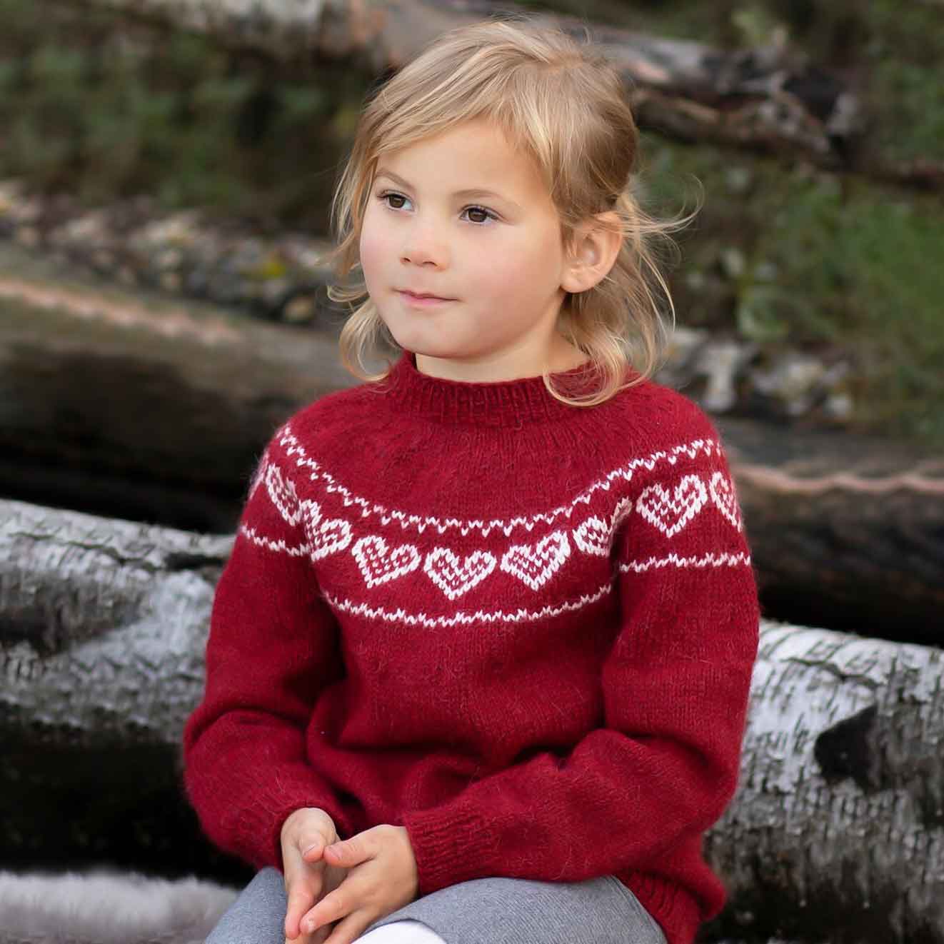 Modellen har en klassisk rund ok där tröjans huvudmotiv – en vacker hjärtbård – löper som ett dekorativt band runt överkroppen. Hjärtana stickas i en kontrasterande färg och skapar ett tydligt men harmoniskt mönster som känns både barnvänligt och traditionellt.