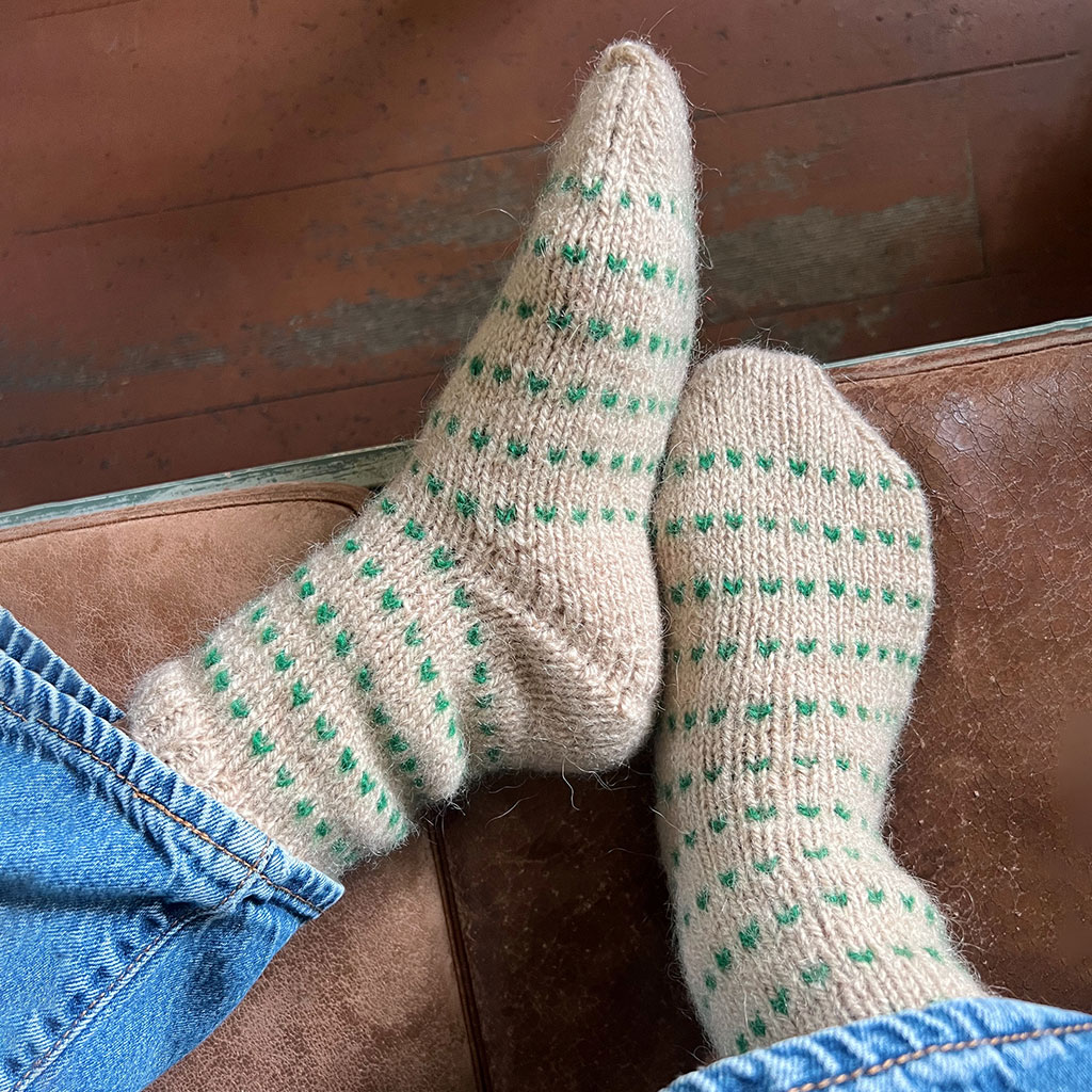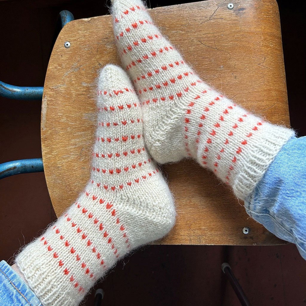 Garnet är Vandre från Rauma Garn – ett hållbart, varmt och lite fluffigt ullgarn med naturlig känsla, gjort för att tåla användning och hålla formen. Kombinationen av slitstyrka och mjukhet gör sockorna lika redo för soffmys som för kalla golv och innestövlar i hallen.