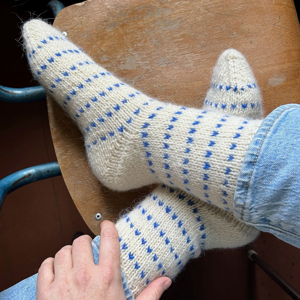 485 Dado prikkesokker är slätstickade raggsockor med små pricka-ränder i kontrastfärg – enkelt, lekfullt och väldigt snyggt. De stickas uppifrån och ner, med häl formad med vändvarv och klassisk tåminskning, så du får en bra passform som sitter skönt på foten.