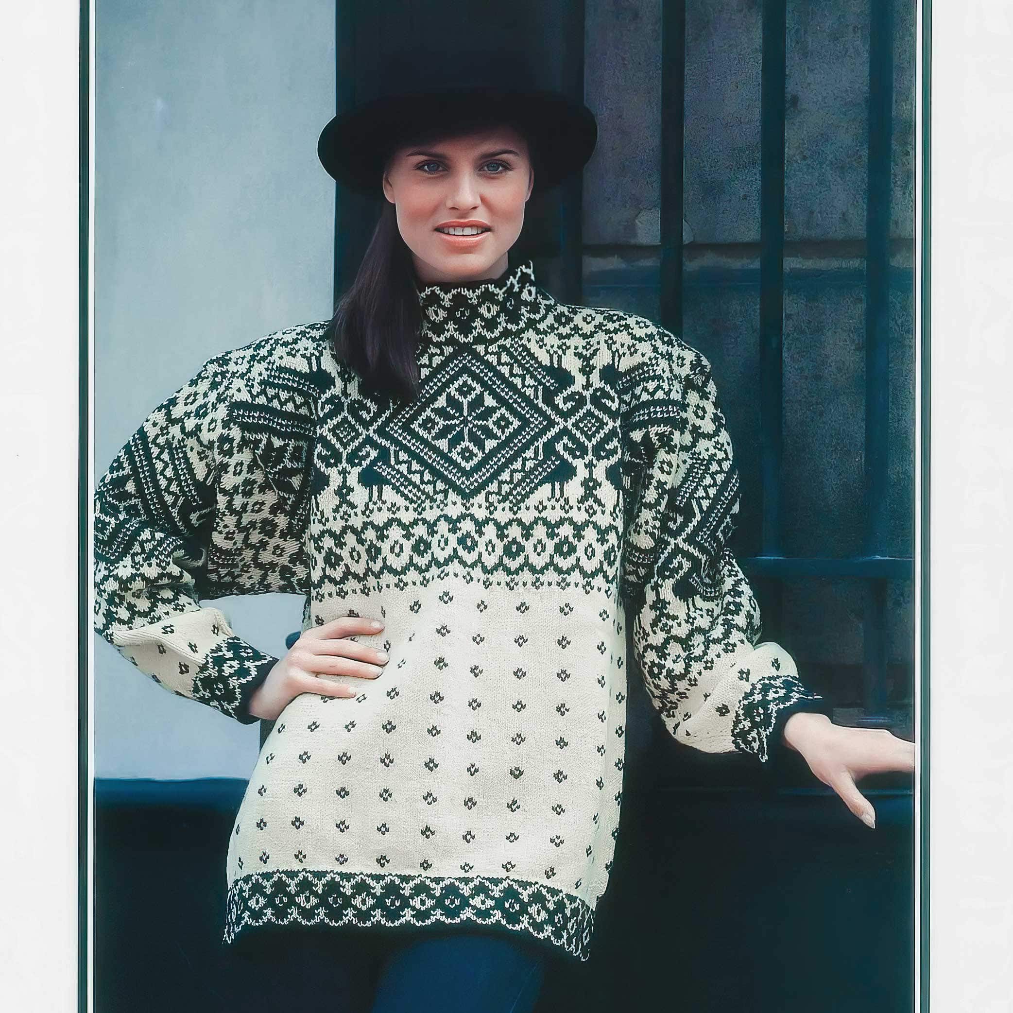 Tröjan stickas runt nerifrån och upp med mönster på oket. Ärmar och bål stickas separat och monteras därefter. Avslutas med en hög halskant som ger ett klassiskt och värmande plagg.