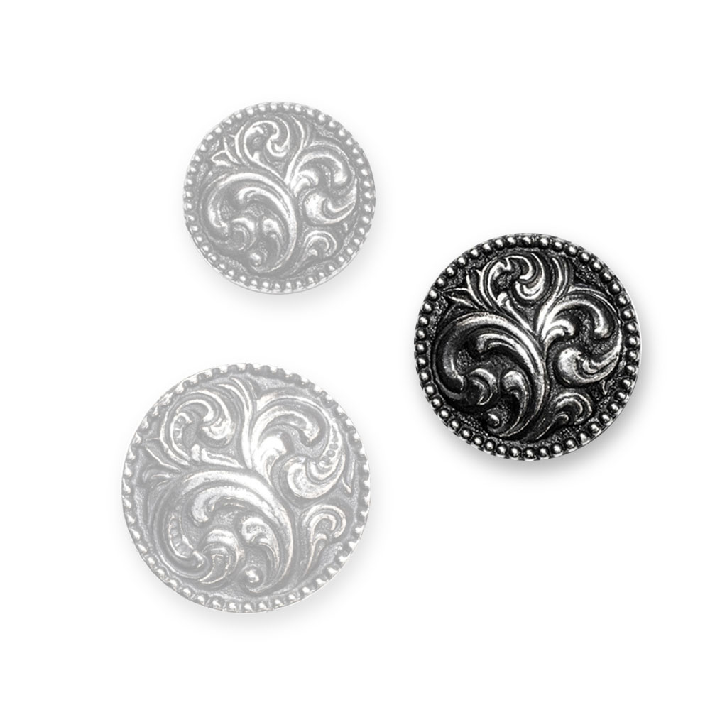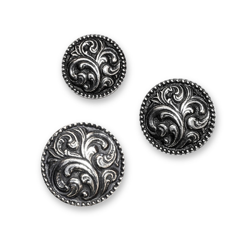 I vårt sortiment kan vi erbjuda gjutna knappar och spännen i tenn, tillverkade i Norge. Dessa oxiderade tennknappar heter ”Aase” och finns i Ø 21 mm